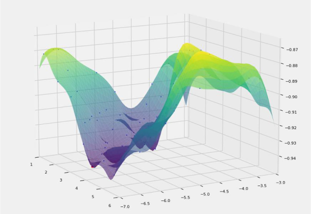 Пример целевой функции в одной из прикладных задач настройки параметров. Наглядно виден сложный характер поведения функции; точки соответствуют выполненным поисковым испытаниям.